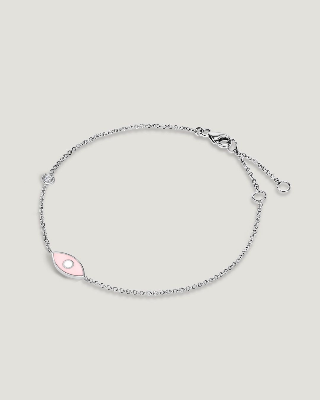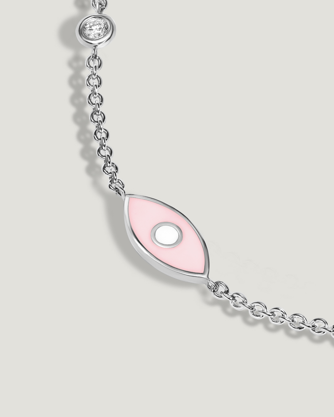 צמיד חוט זהב עדין עם עין אמייל בצבע ורוד בייבי ואישון לבן ולידה משובץ יהלום קטן, עיצוב שמרגיש רך אך מלא כוח פנימי. ההשראה היא מאריתה פרנקלין “מלכת הסול”, אישה שהקול שלה הצליח להיות גם חיבוק וגם קריאת עוצמה. כך גם הצמיד הזה, עדין במראה אבל משאיר חותם חזק ומרגש