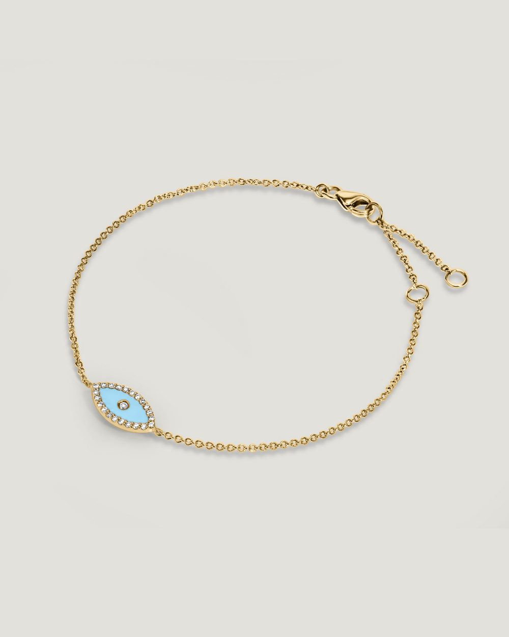 צמיד חוט זהב דק עם עין אמייל טורקיז, שיבוץ יהלומים מסביב ויהלום במרכז, תכשיט שהוא הרבה מעבר ליופי. ההשראה מדיאן פון פירסטנברג, מעצבת שהפכה את עולם האופנה לשפה של ביטוי עצמי וביטחון. כך גם הצמיד הזה, תכשיט שמרגיש אישי, נועז ומעורר השראה.