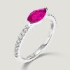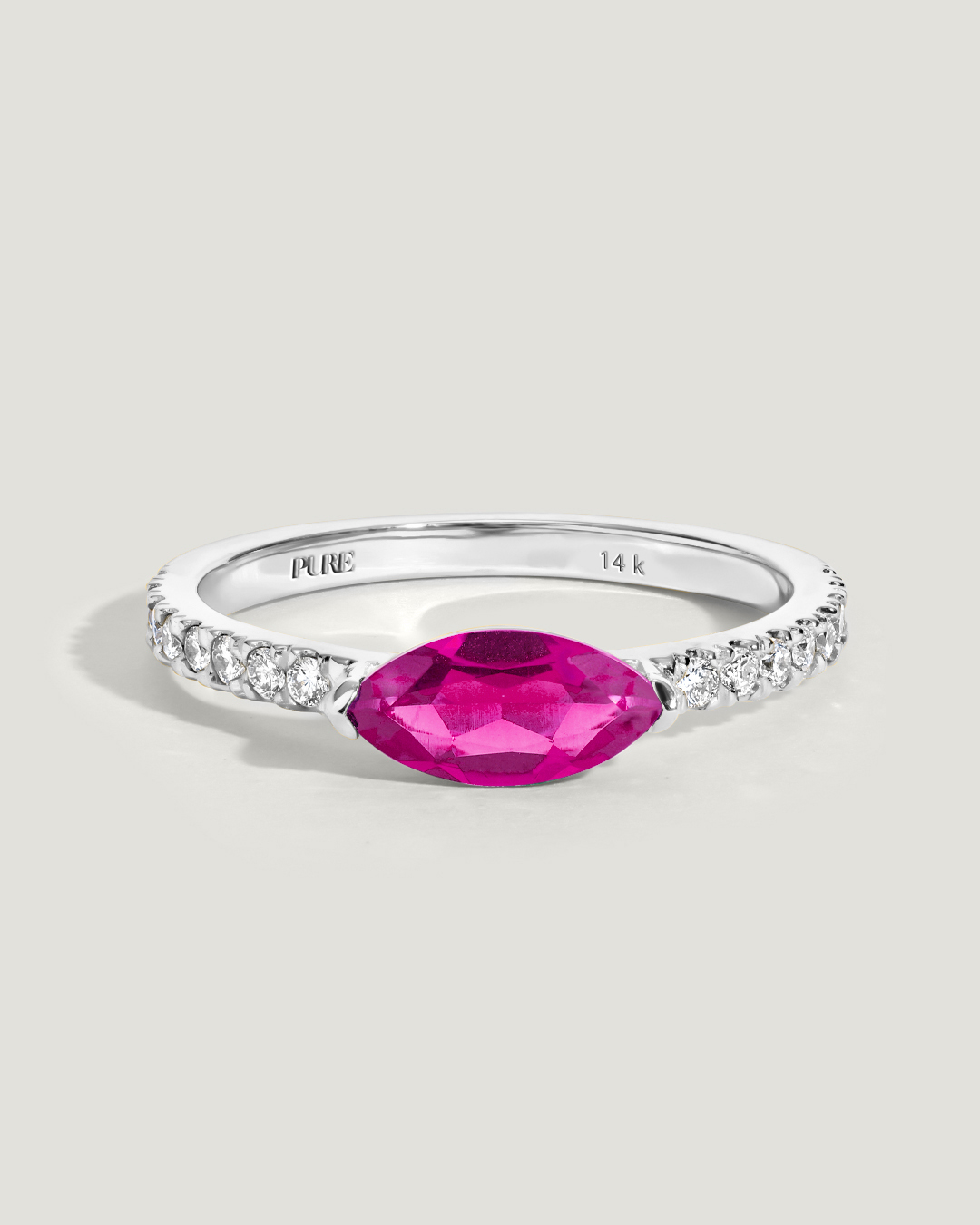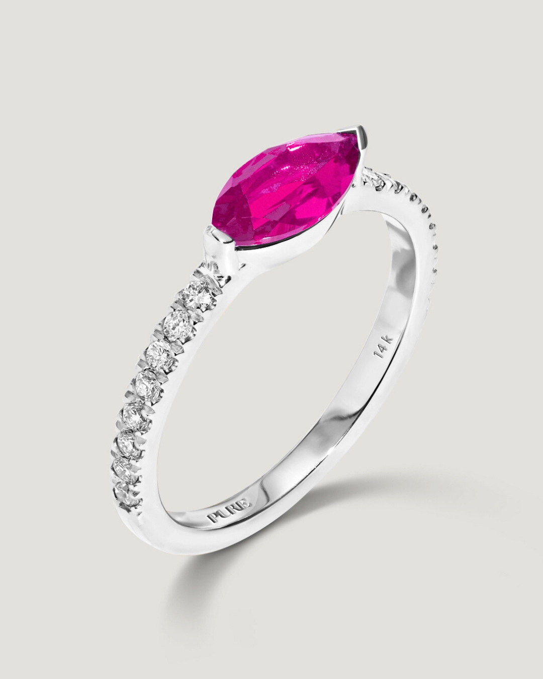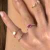 אבן חן ספיר ורודה בחיתוך מרקיזה משובצת על טבעת חצי איטרניטי, תכשיט מלא חיים וקריצה. ההשראה מאיריס אפפל, יזמית, מעצבת ואחת הנשים הצבעוניות והנועזות בעולם האופנה. הטבעת הזו היא מחווה לרוח החופשית שלה, ששמה צבעוניות במרכז ומוכיחה שסטייל הוא נצחי