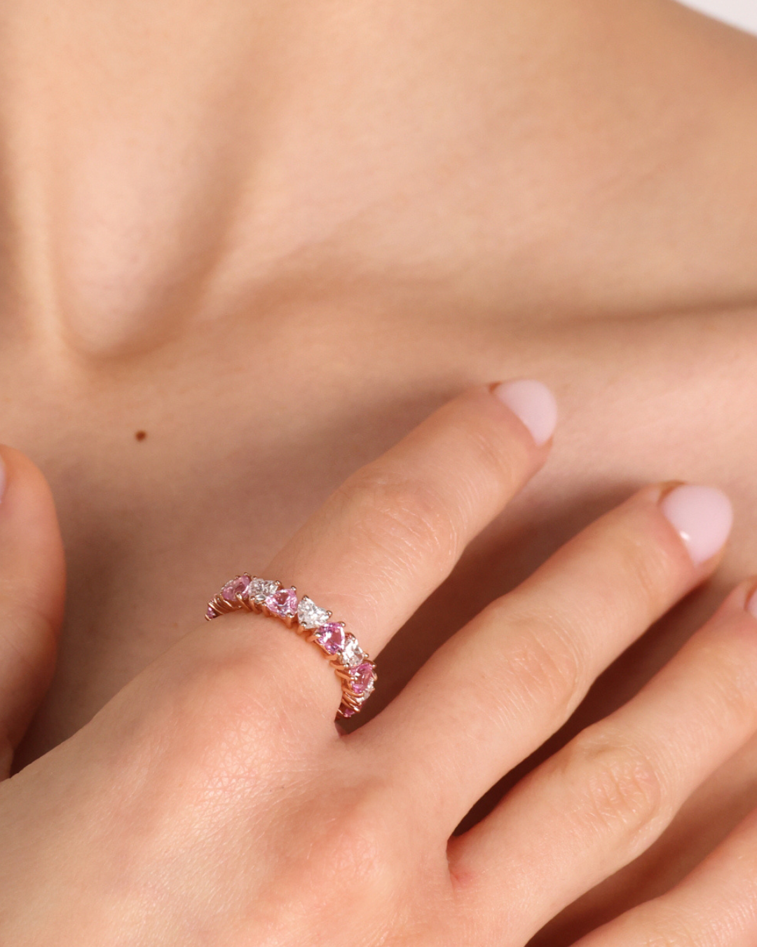 טבעת איטרניטי משובצת יהלומים ואבני ספיר ורודות, טבעת משדרת עוצמה ונשיות, לא מתנצלת ומסובבת ראשים בכל הזדמנות. הטבעת בהשראת ליה, הבת הגדולה מתוך השלוש של אבי, הבעלים של המותג שלנו, ילדה חזקה ועצמאית בדיוק כמו הטבעת הזו, שמוקדשת לה באהבה
