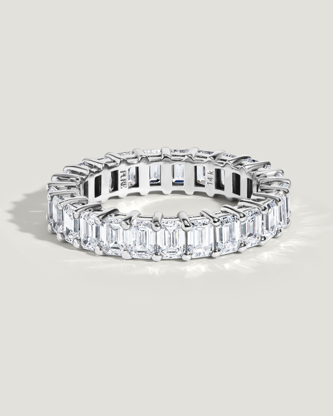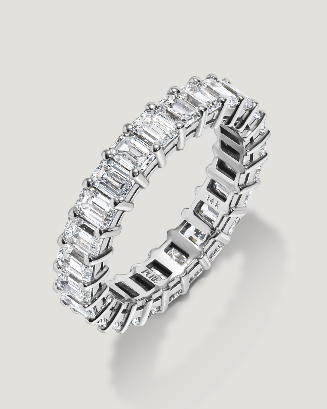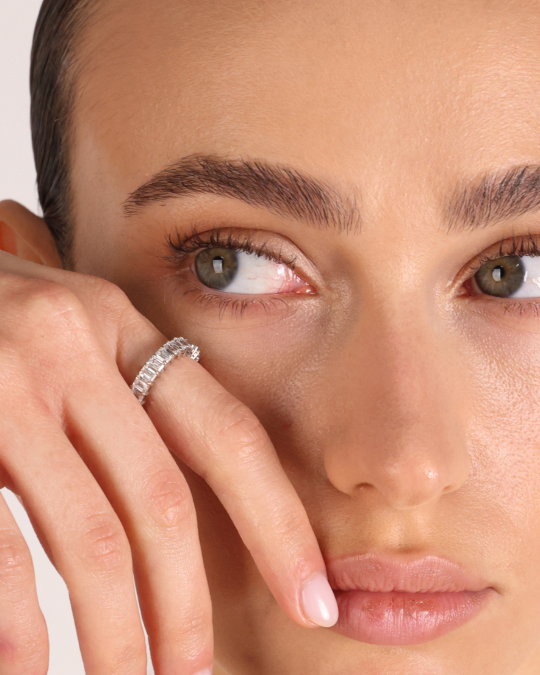 טבעת איטרניטי מדויקת עם יהלומי אמרלד, עיצוב מתמשך, מדויק ומלא נוכחות. ההשראה מנוואל א-סעדאווי, שנלחמה ללא פחד למען חופש המחשבה והאישה. הטבעת הזו לוכדת את אותה עוצמה שמקיפה מכל עבר, וניראות חדה ונכונה