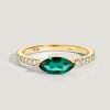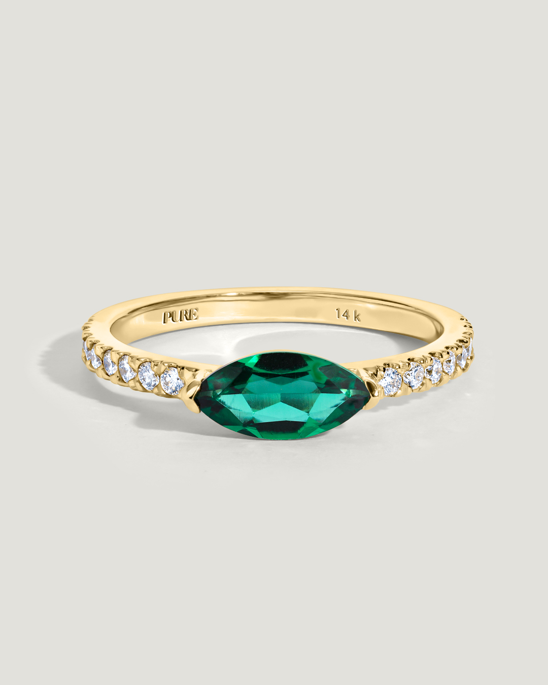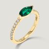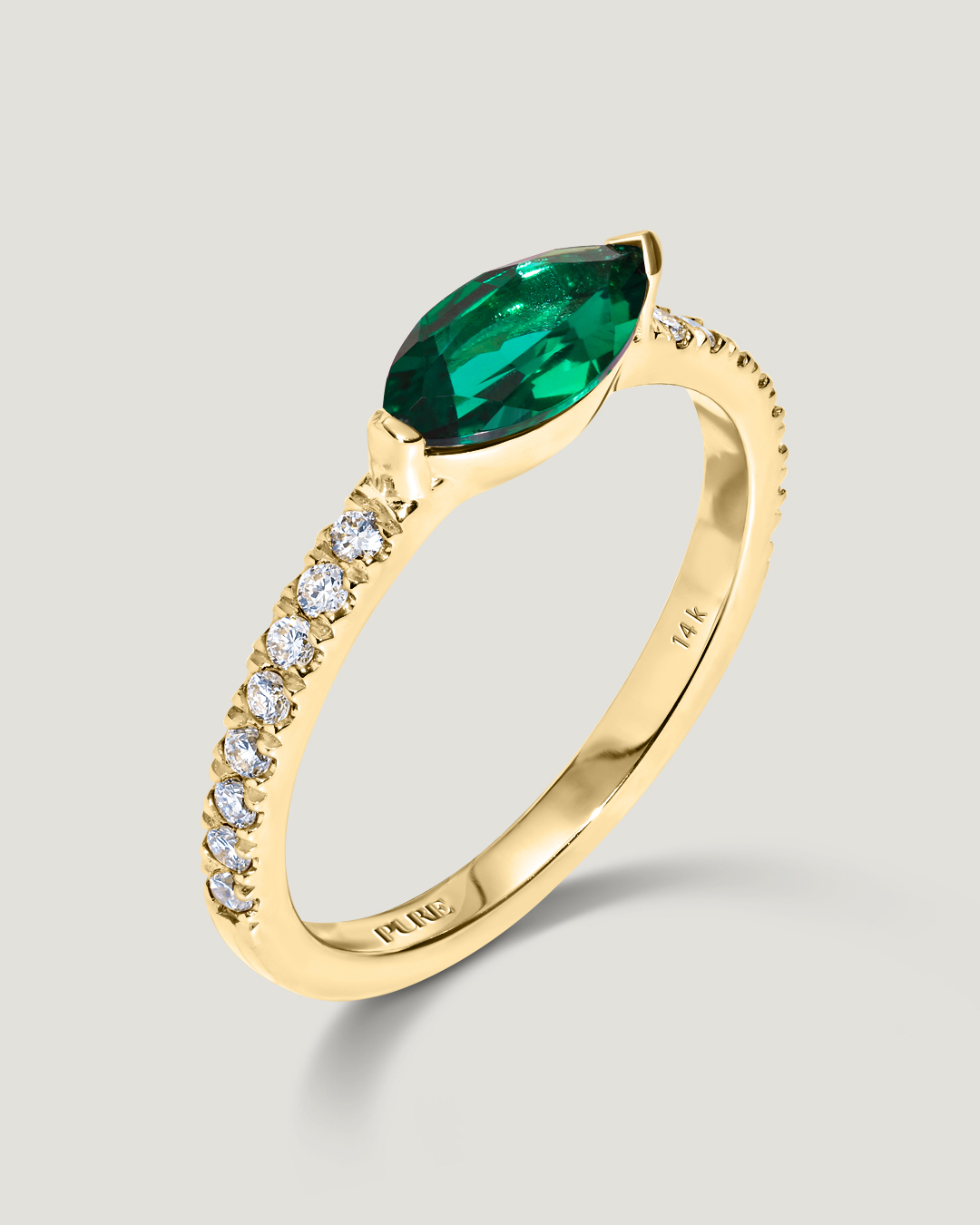 טבעת מרקיזה אנכית עם אבן חן אמרלד ירוקה ושיבוץ חצי איטרניטי, עיצוב שמחבר בין יופי טבעי לעוצמה עולמית. ההשראה מנירמלה סיטרמן, מזכ"לית האו״ם לשינויי אקלים, שמובילה את השיח על עתיד בר-קיימא. כמו האבן הזו, גם היא מייצגת את הצבע של תקווה, איזון ועולם ירוק יותר