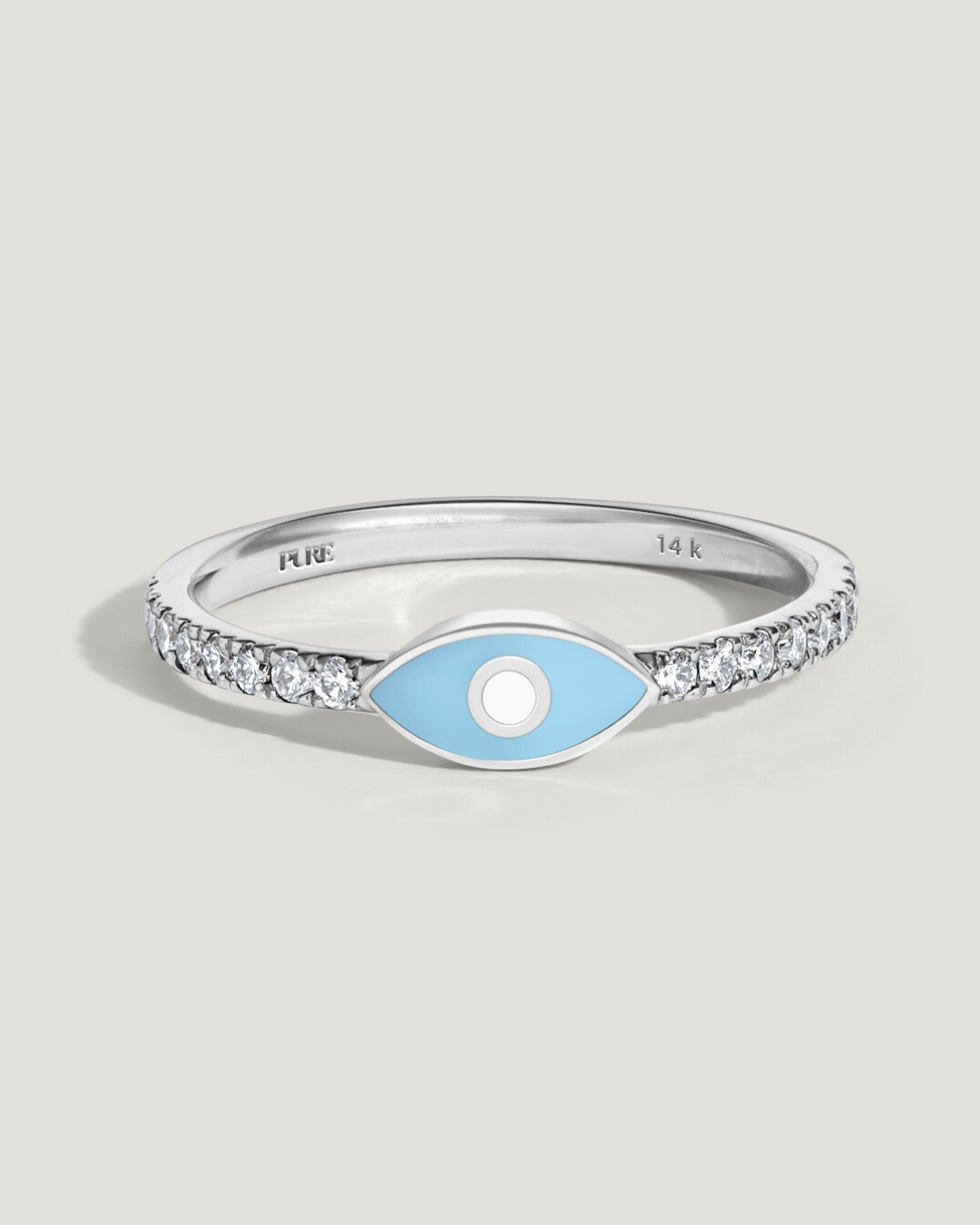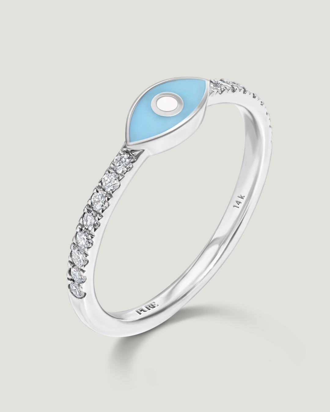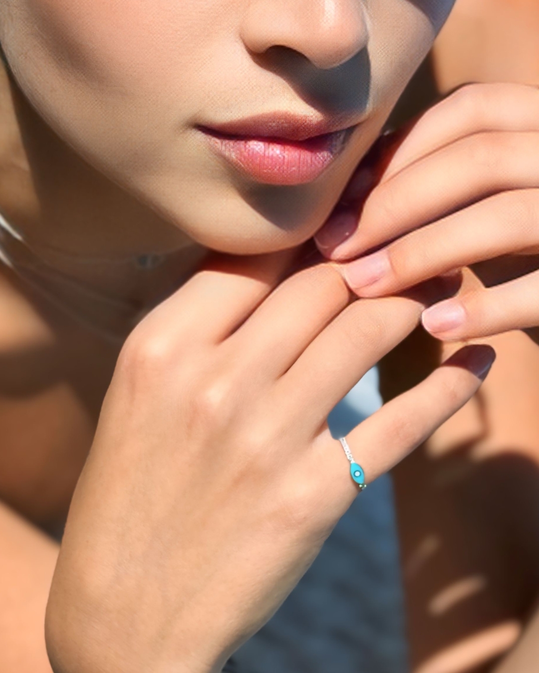 טבעת עין אמייל בצבע טורקיז תכלת עם אישון בצבע לבן. טבעת עמוקה, נקייה שמשדרת יופי צעיר, אנרגיה צעירה ממגנטת ויופי שאי אפשר להתעלם ממנו. הטבעת בהשראת רפאל,הבת של אבי הבעלים של המותג שלנו, והטבעת הזו מוקדשת לה באהבה