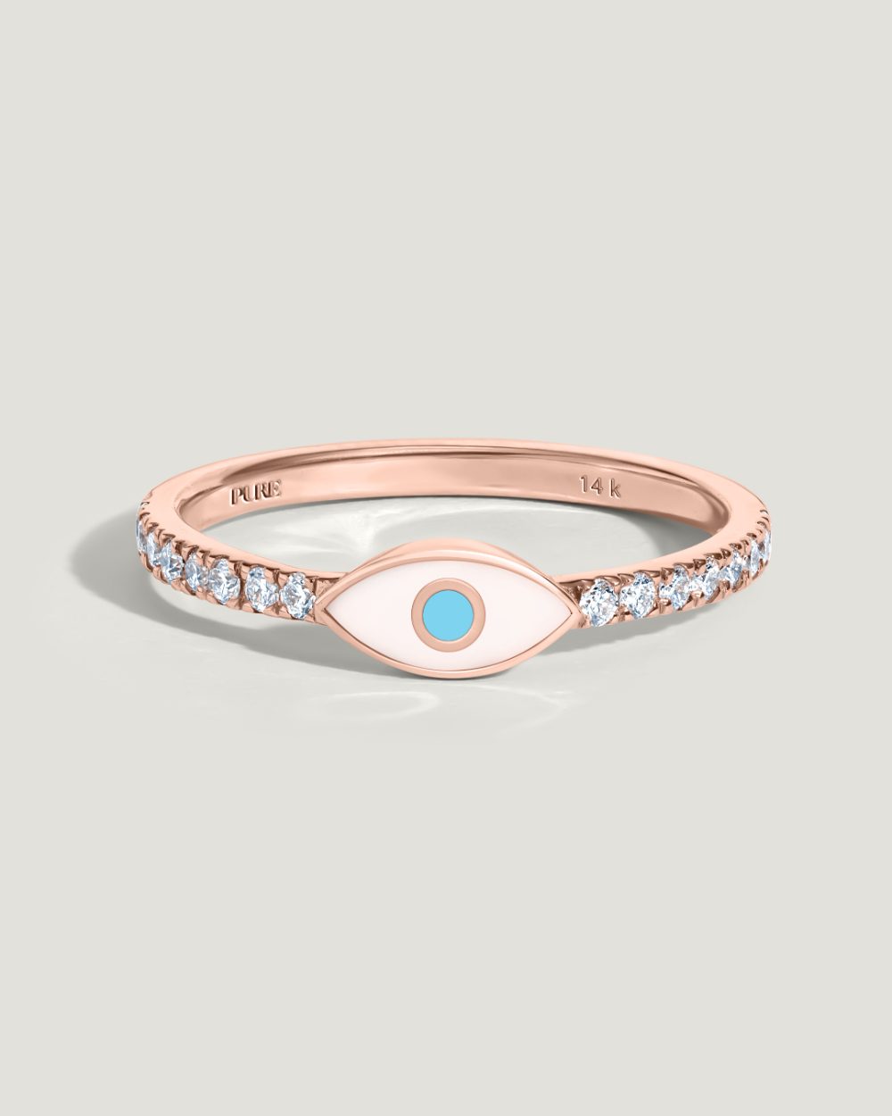 טבעת עין אמייל בצבע שמנת עם אישון בצע טורקיז. טבעת מלאה חיות, צעירה ושובבה שמשדרת אופי אנרגטי וכיפי שאי אפשר לעמוד בפניו, והיא בהשראת רנה, הבת הקטנה של ערן אחד ממקימי המותג שלנו, והטבעת הזו מוקדשת לה באהבה