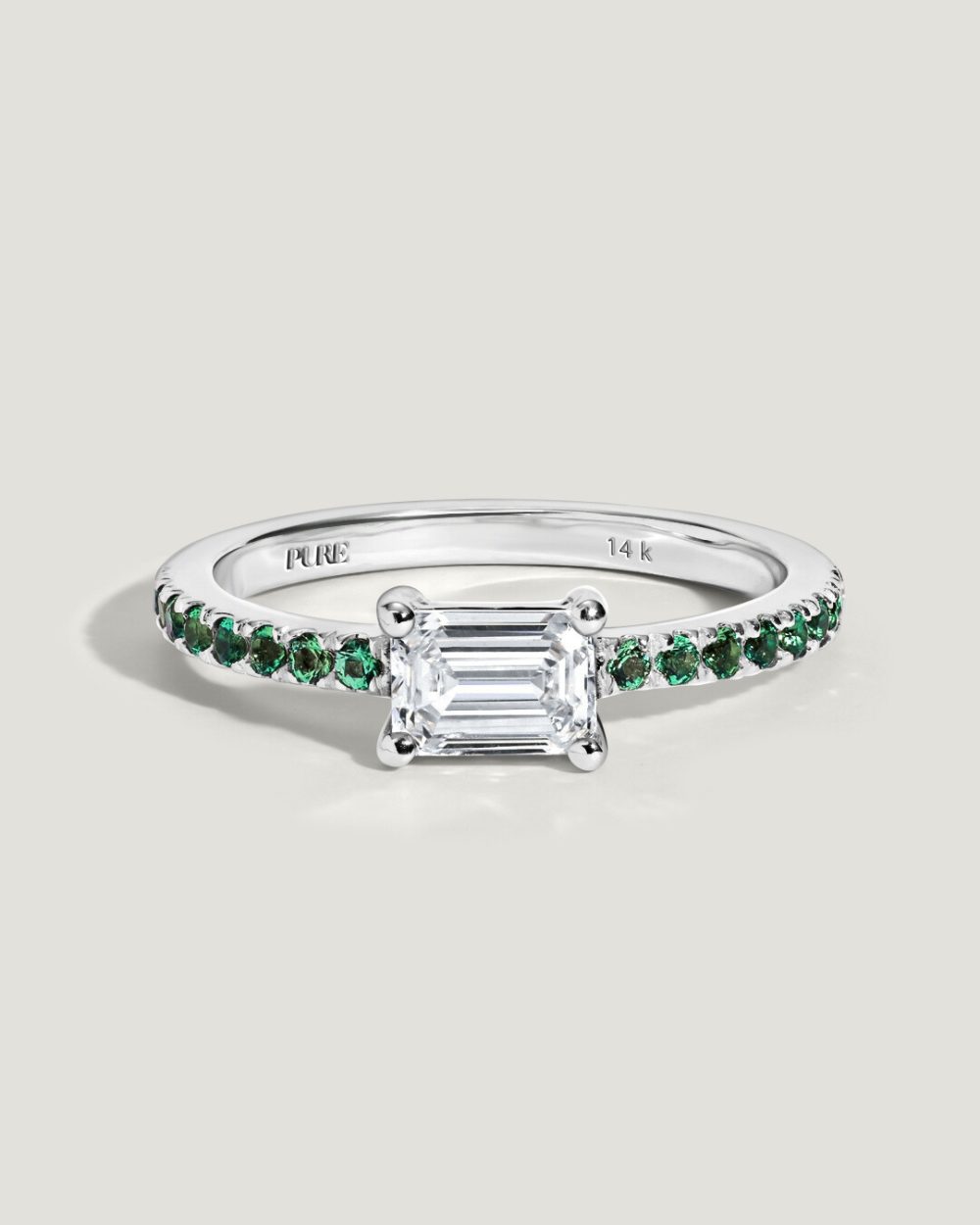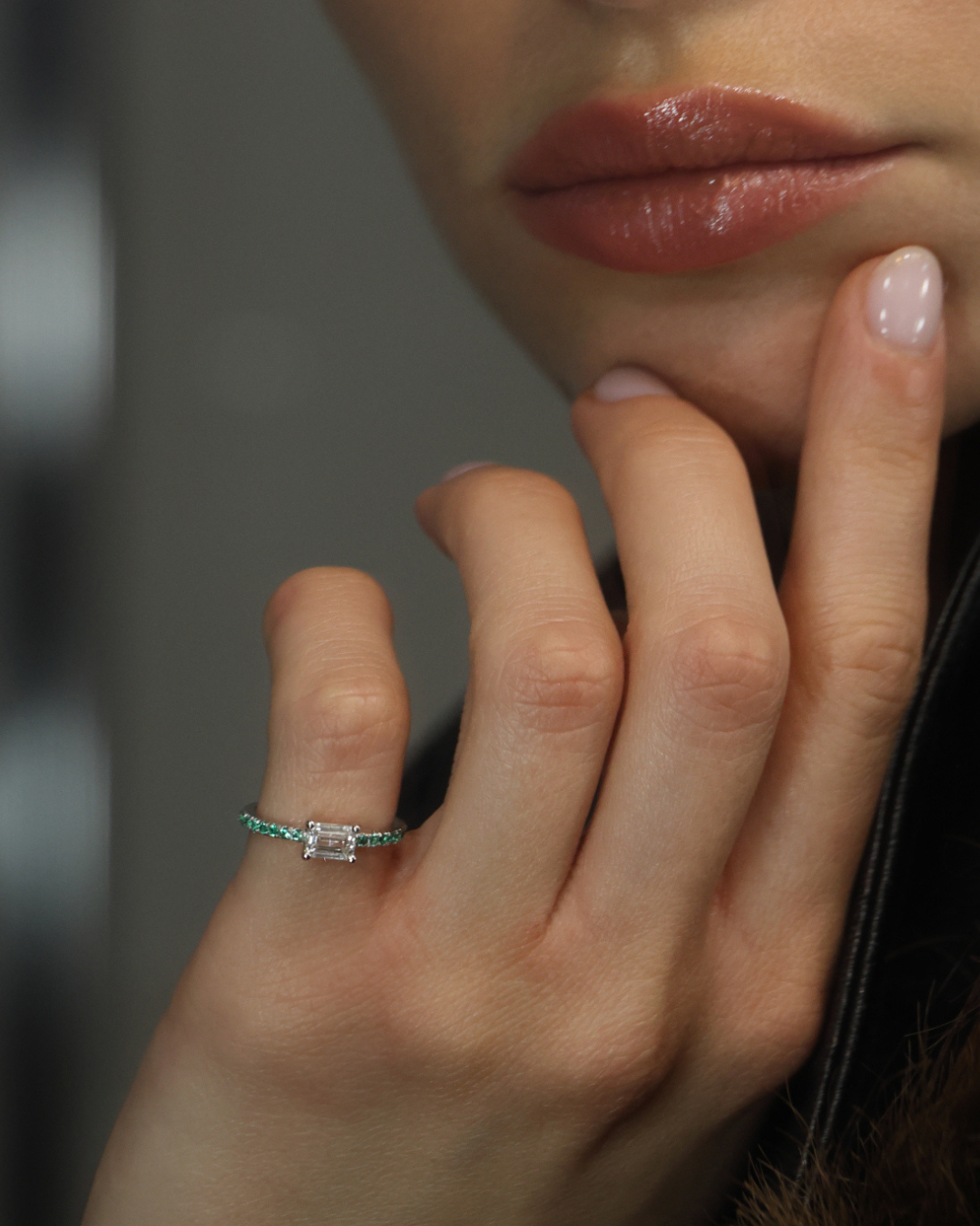 טבעת אמרלד אנכית עם שיבוץ אבני אמרלד ירוקות על החישוק, תכשיט שמרגיש כמו מנגינה לעיניים. ההשראה מסולנג' נואלס, זמרת שידועה בסגנון אישי וייחודי, שמאז ומתמיד בחרה לבלוט בדרך שלה. כך גם הטבעת הזו, יצירה שלא מתאימה את עצמה לכללים, אלא מכתיבה אותם