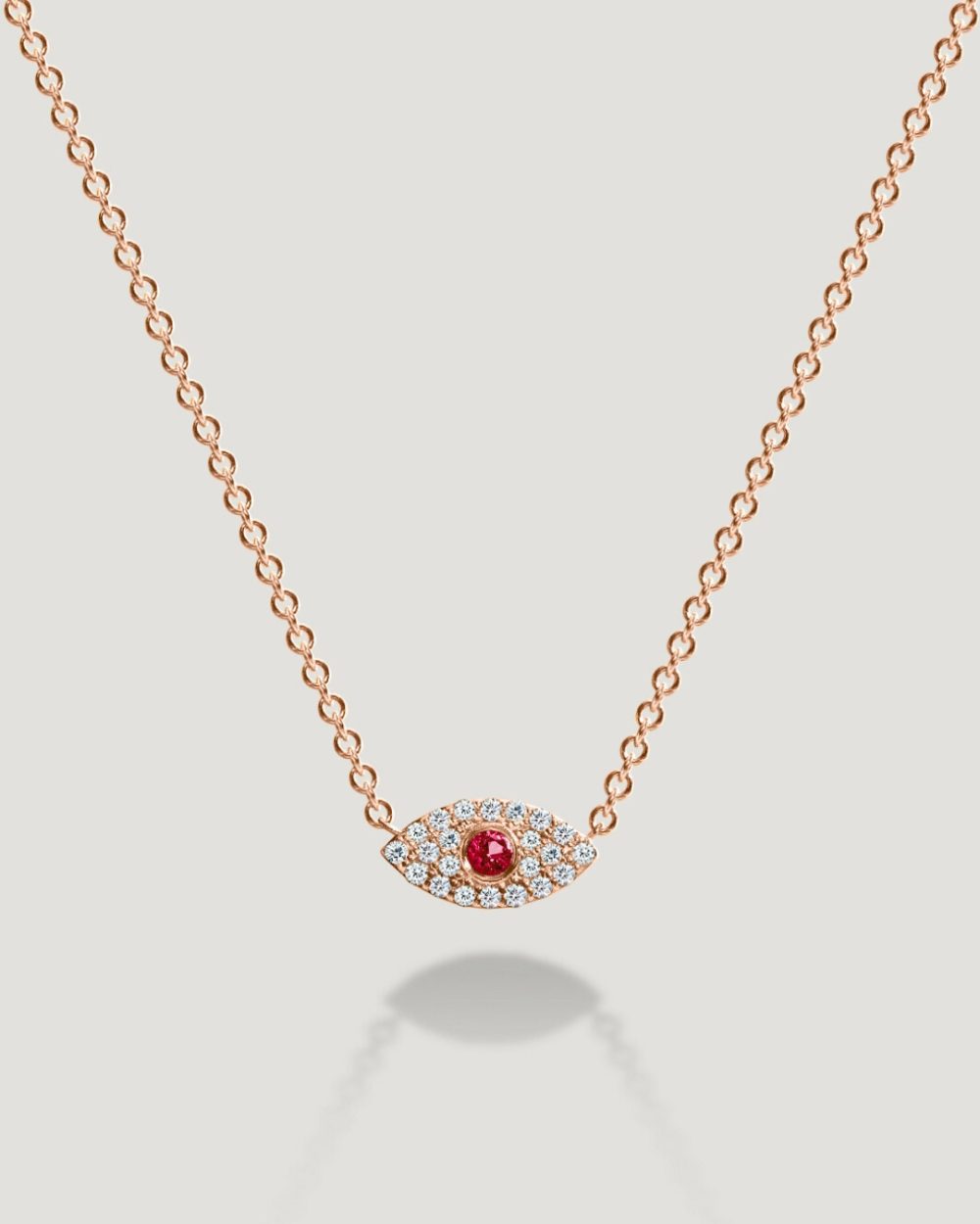שרשרת עין עם אבן חן רובי אדומה בוהקת ויהלומים מסביב, פריט שמשדר נוכחות אלגנטית עם קריצה נועזת. ההשראה מטמארה מלון, אישה שבנתה את מותג העל ג'ימי צ'ו סביב כוח נשי, ביטחון עצמי ורגעים קטנים. כך גם השרשרת הזו, אלגנטית, צבעונית ומלאת חיים